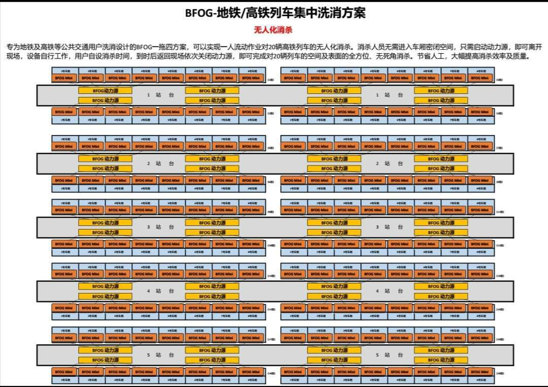 3、设备选型灵活,可根据用户需求设计专业消杀方案,可多空间、大空间同时消杀,大大降低消杀人员的数量及工作量。如可实现一人对多列地铁列车同时展开“无人化”快速消杀。